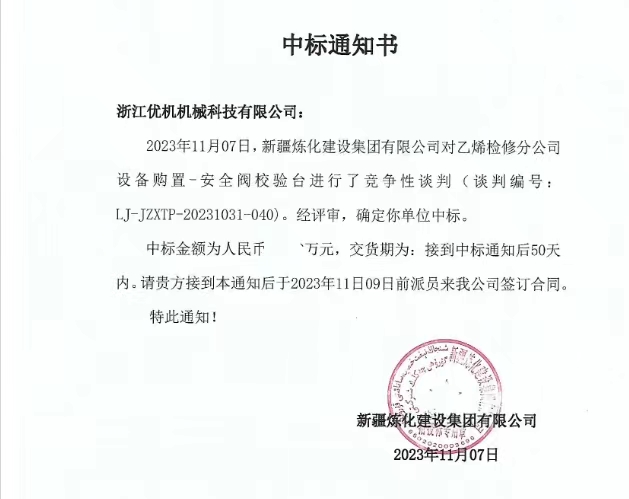 近期,浙江優(yōu)機機械科技有限公司收到中標通知書,中石油新疆煉化建設集團閥門試驗校驗項目,三次添加設備購置項目-安全閥校驗臺,經(jīng)評審確定中標(談判文件編號:LJ-JZXTP-20231031-040),合計三期閥門檢測校驗設備總數(shù)達到12臺(套)金額叁佰多萬,該項目是浙江優(yōu)機機械科技有限公司主營產(chǎn)品閥門檢測校驗設備進入中石油系統(tǒng)樣本項目。
